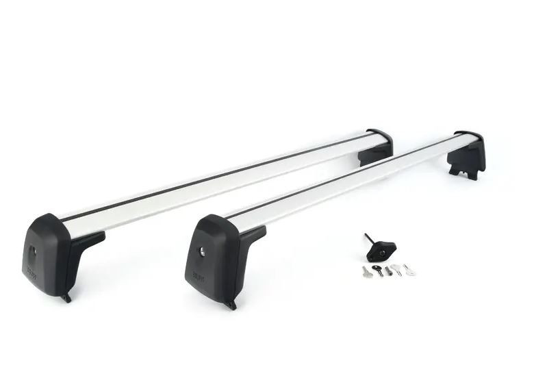 Charge maximale autorisée sur le toit : 75 kg. Les barres de toit sont en profilé d'aluminium haute résistance. Elles comportent une protection antivol et satisfont aux plus hautes exigences en matière de sécurité.